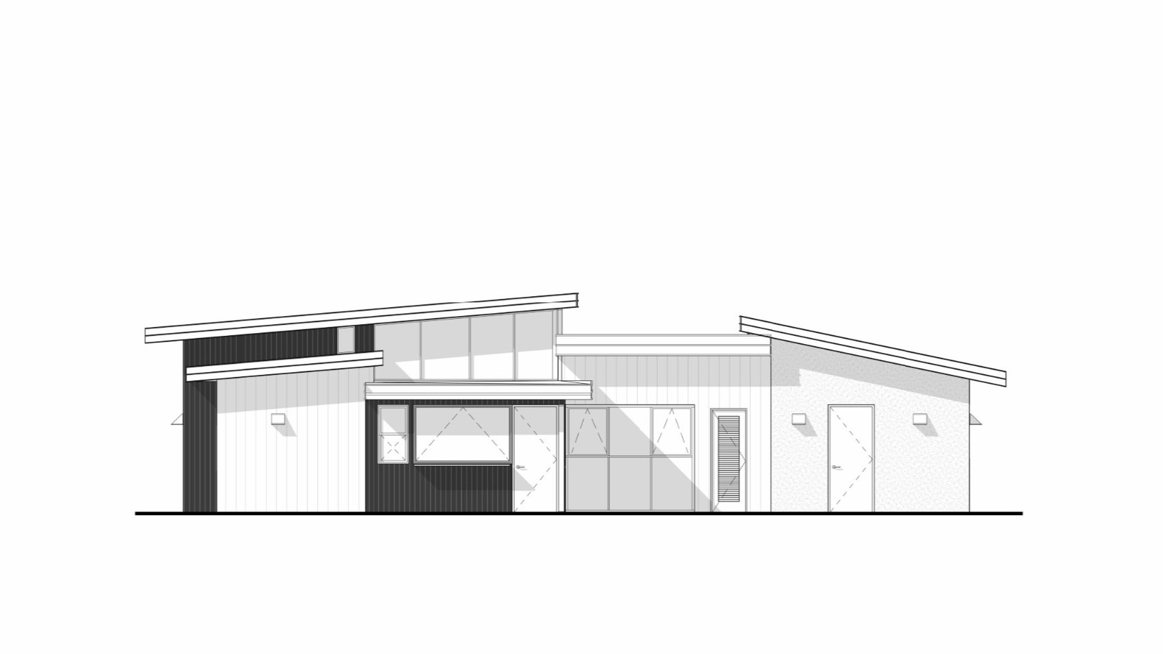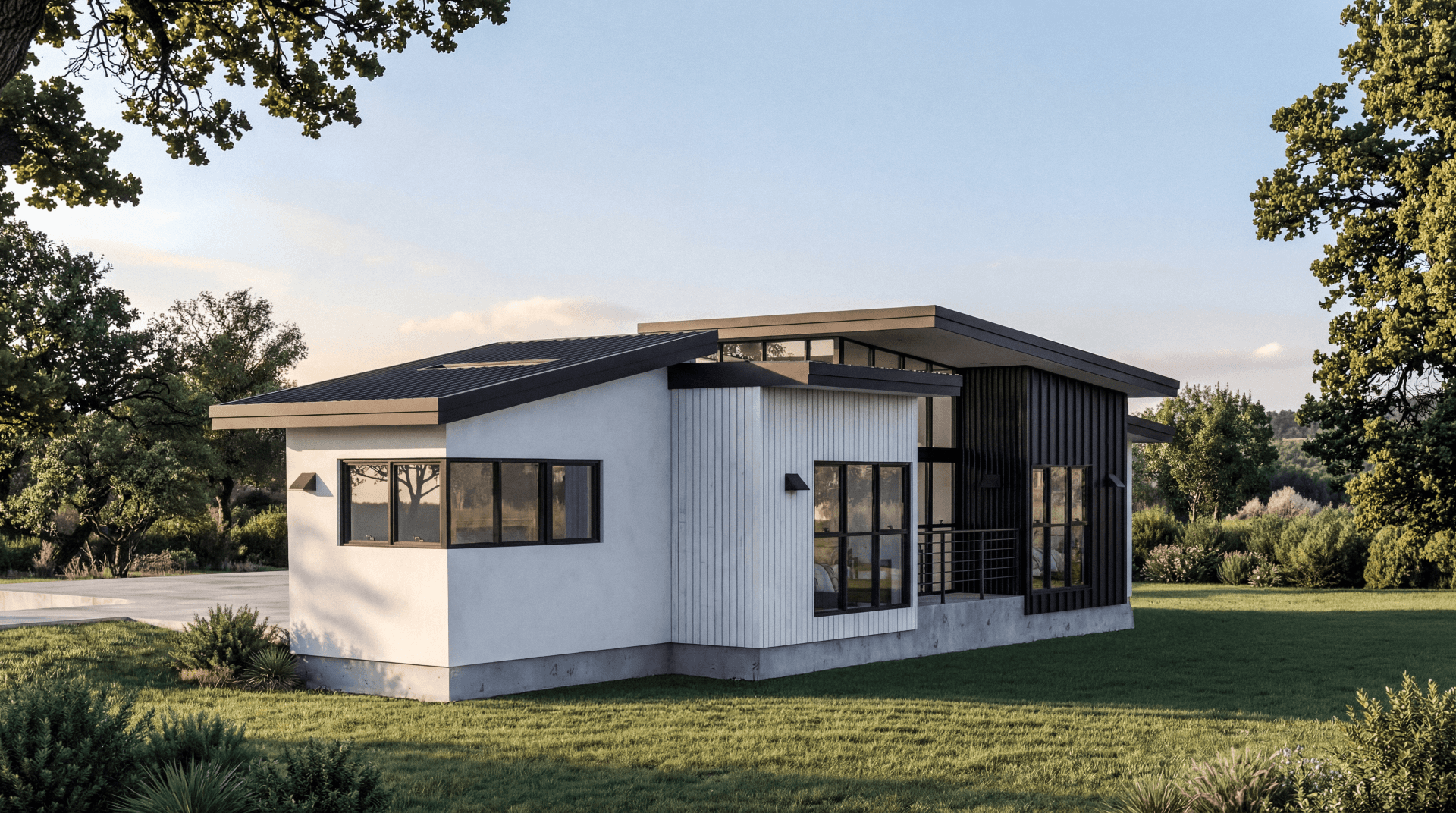 The dwelling’s design carefully breaks down the 800-square-foot volume into distinct, articulated masses, creating architectural depth and moments for strategic openings that frame specific views while maintaining privacy. A restrained material palette of smooth stucco, vertical wood siding, light panels, and dark metal accents emphasizes durability and simplicity, establishing a sophisticated modern form.
