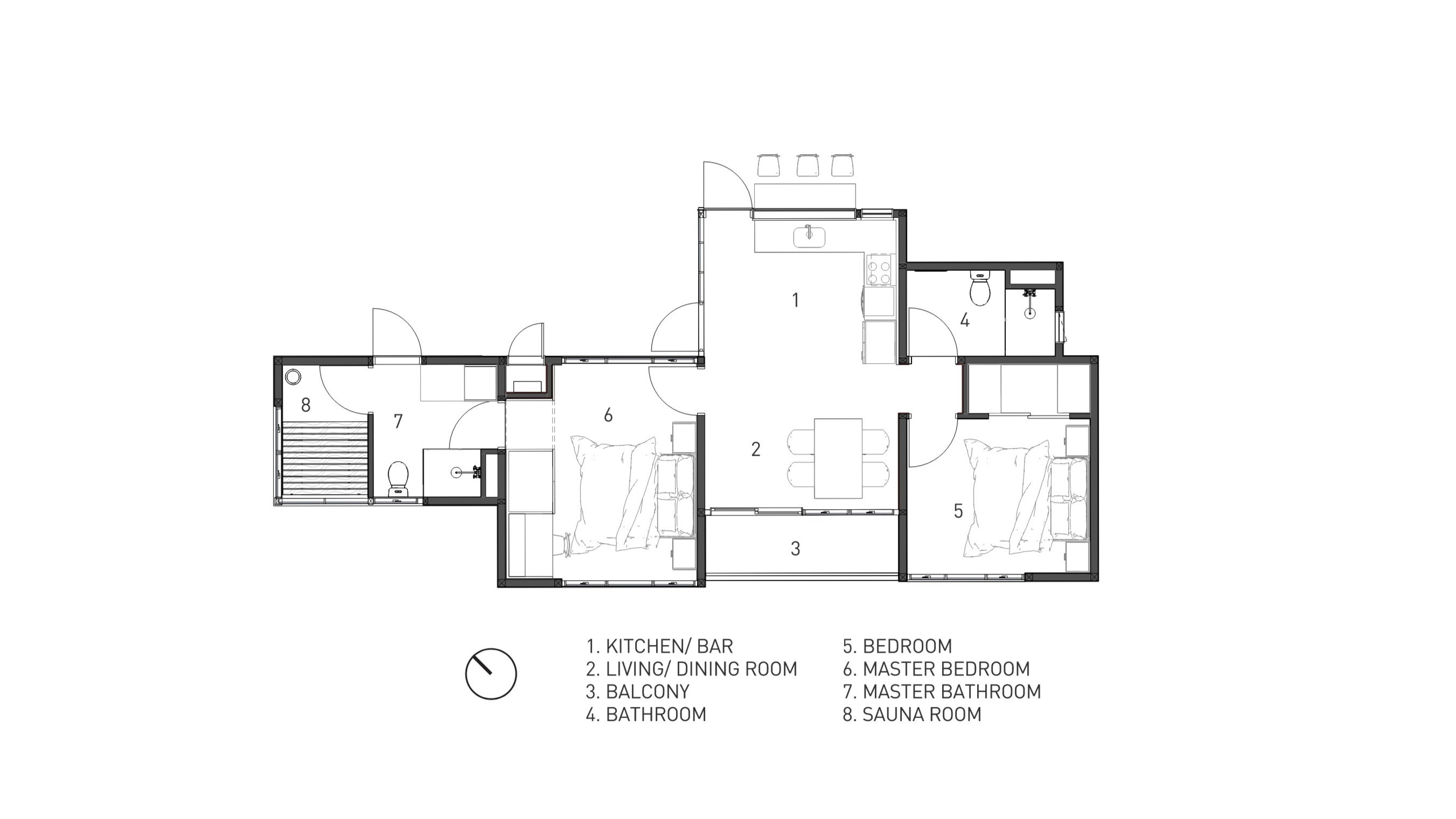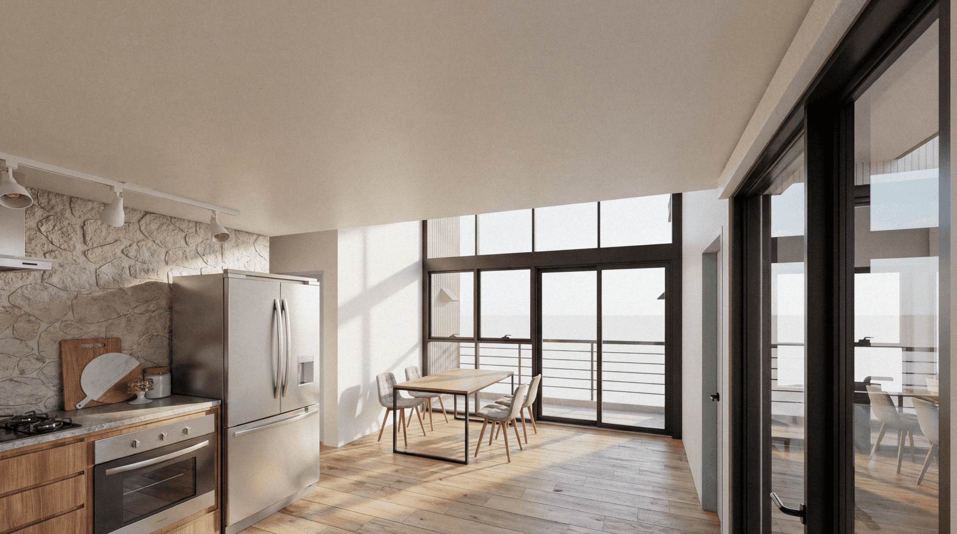 The functional flow is centered on a spacious, light-filled living, dining, and kitchen area, featuring stone accents and high-end finishes, which extends seamlessly through large glass doors to an integrated deck. An intelligent split-level floor plan meticulously separates the two-bedroom program for maximum comfort and flexibility. Each bedroom features abundant natural light and direct bathroom access, with a unique, luxurious sauna room integrated to support everyday well-being.
